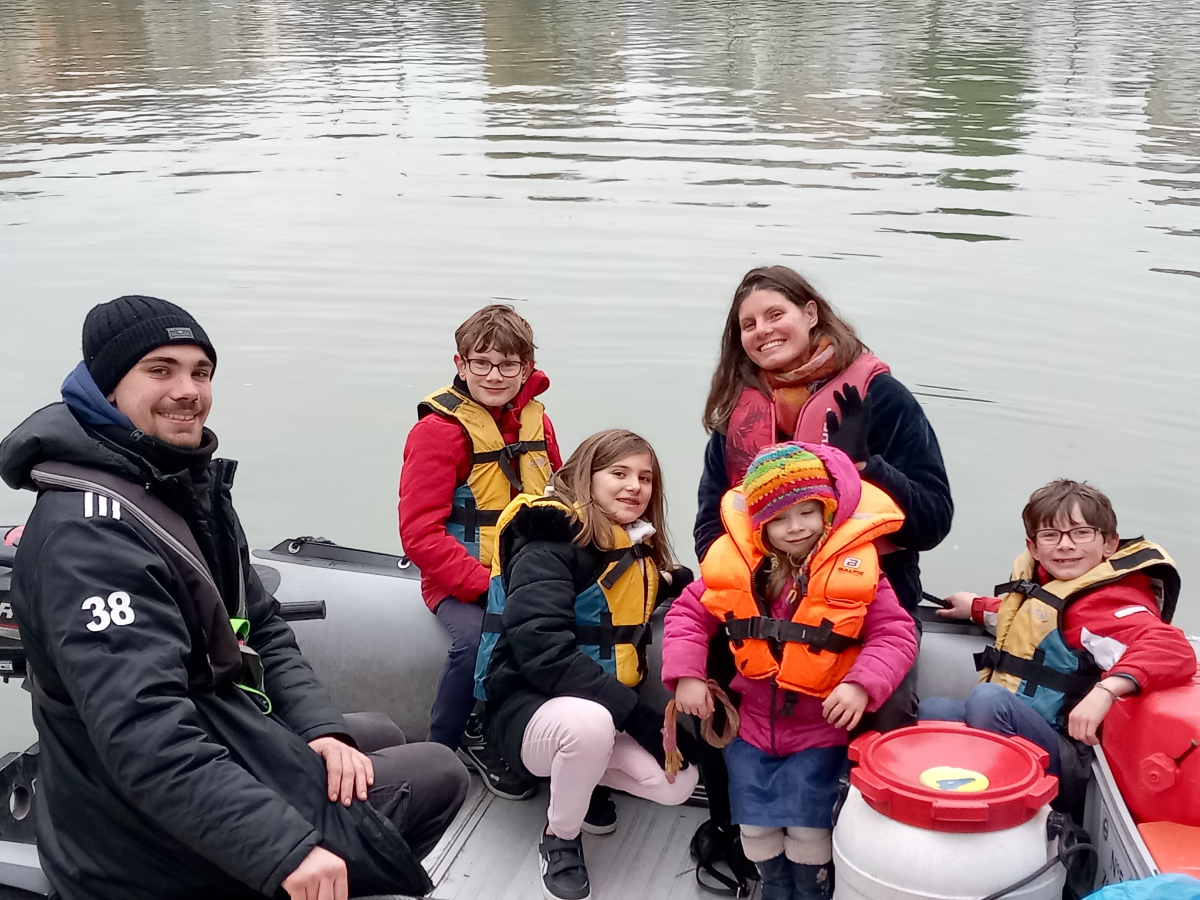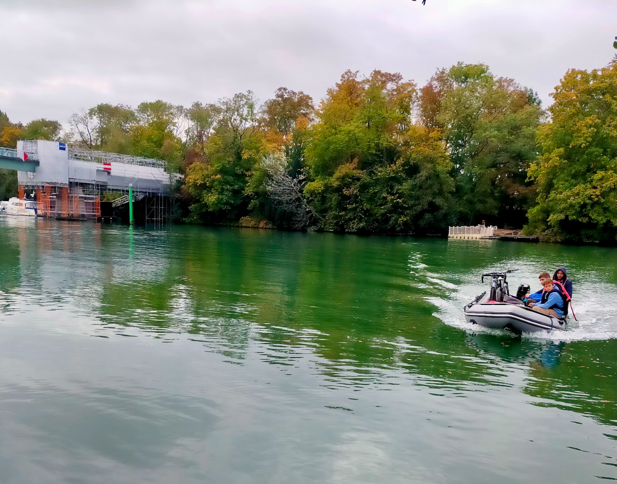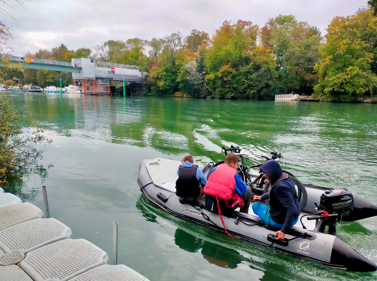 Bateau utilisé pour la navette : Zodiac avec moteur 6 CV sans permis ou motorisation 20 CV en fonction des besoins, plan d’eau, courant…+ pilote expérimenté