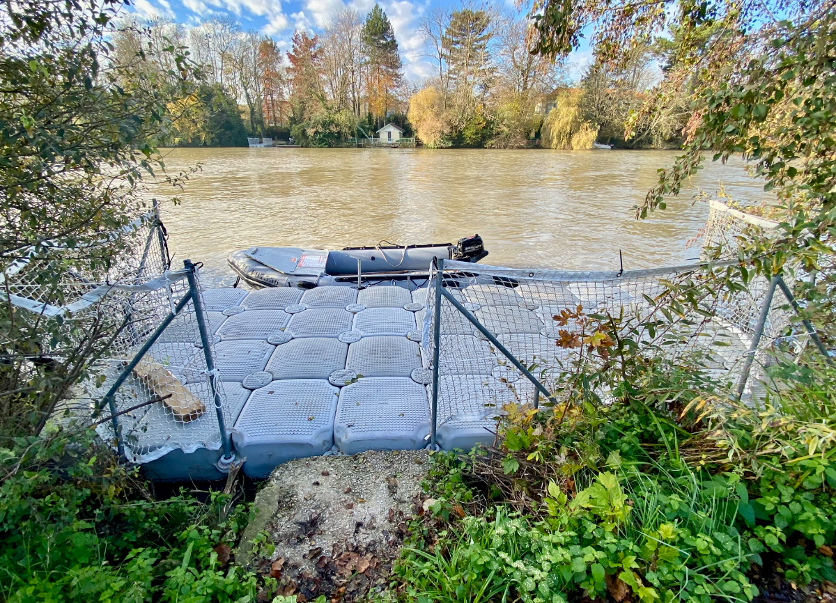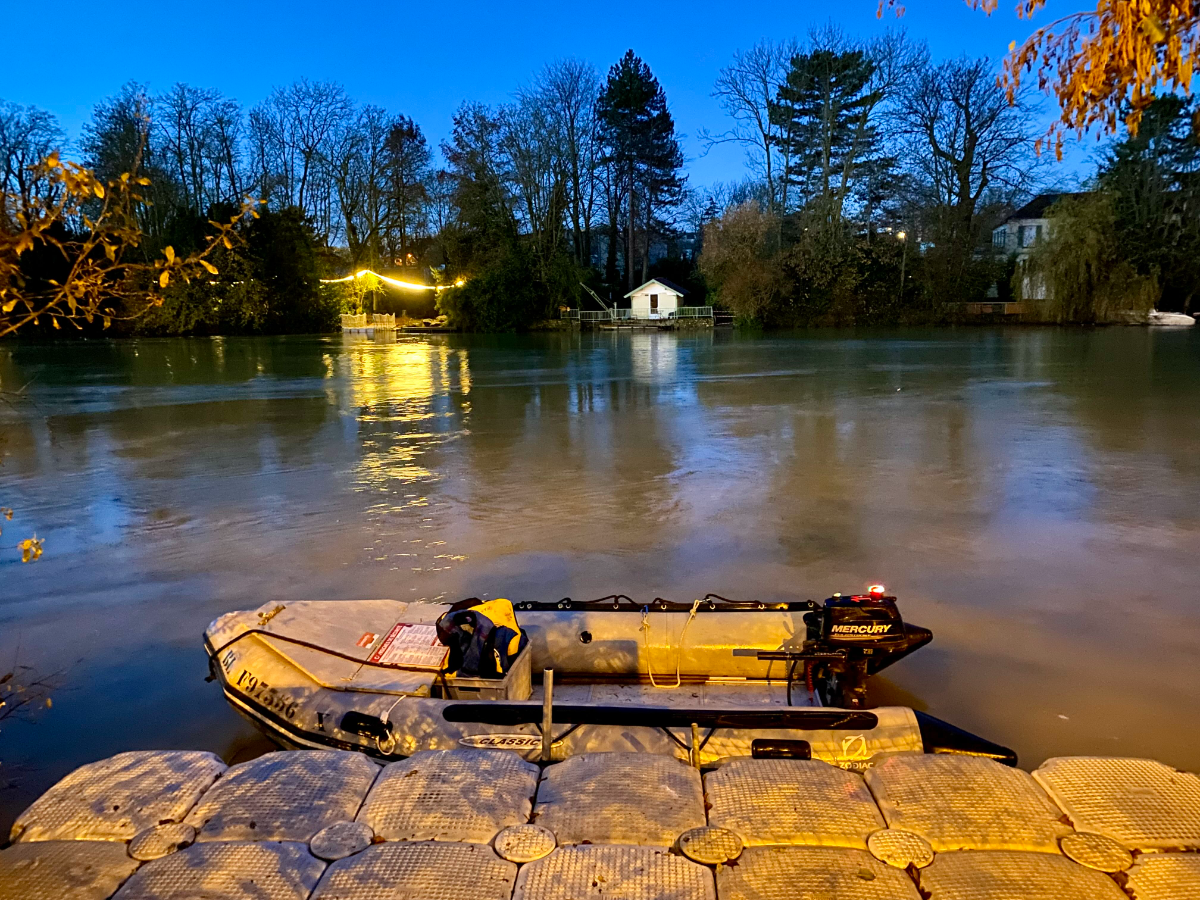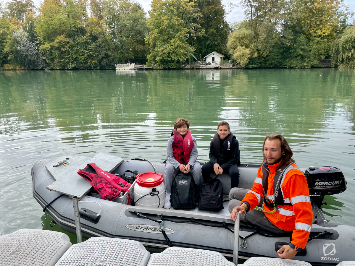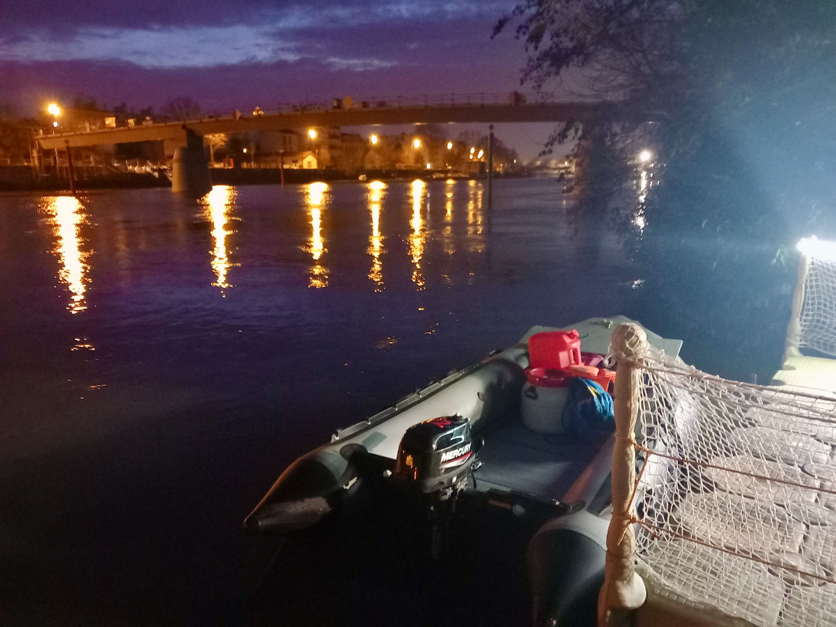 Bateau utilisé pour la navette : Zodiac avec moteur 6 CV sans permis ou motorisation 20 CV en fonction des besoins, plan d’eau, courant…+ pilote expérimenté