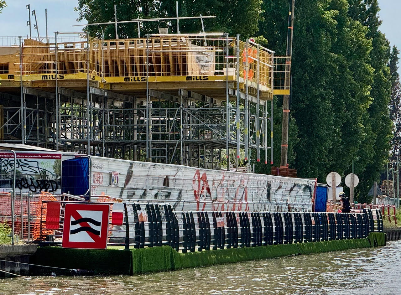 Vue du ponton flottant de 50 mètres sur le canal de l’Ourcq