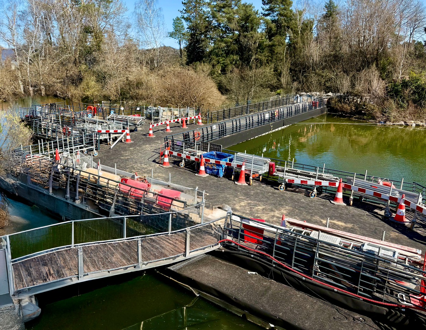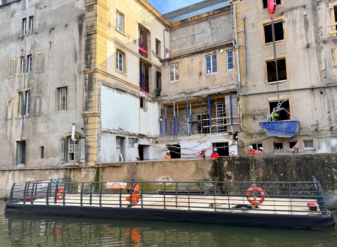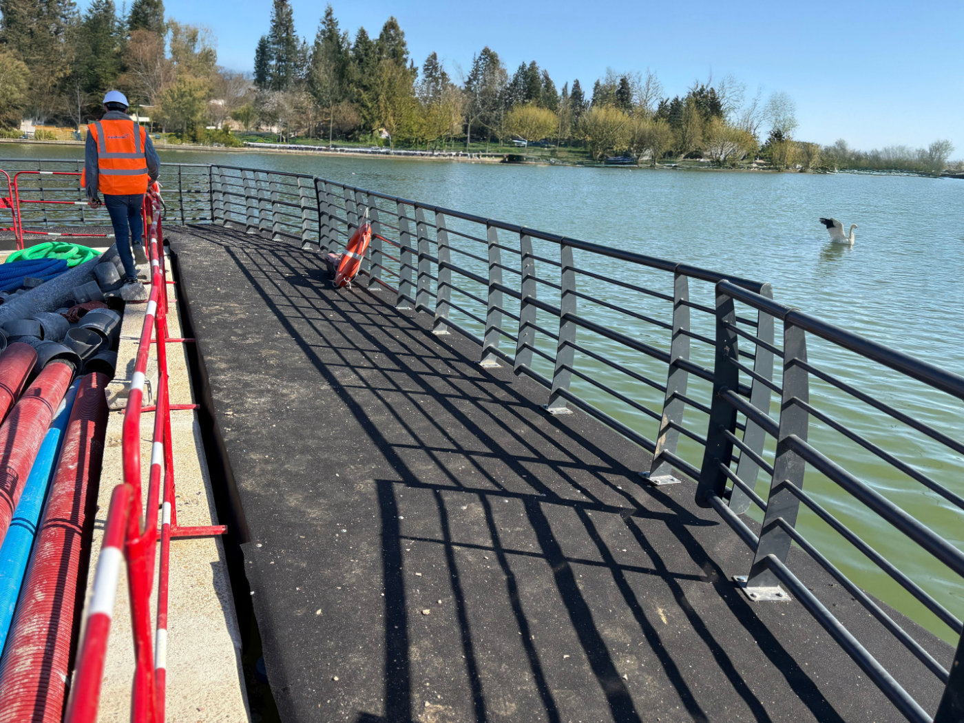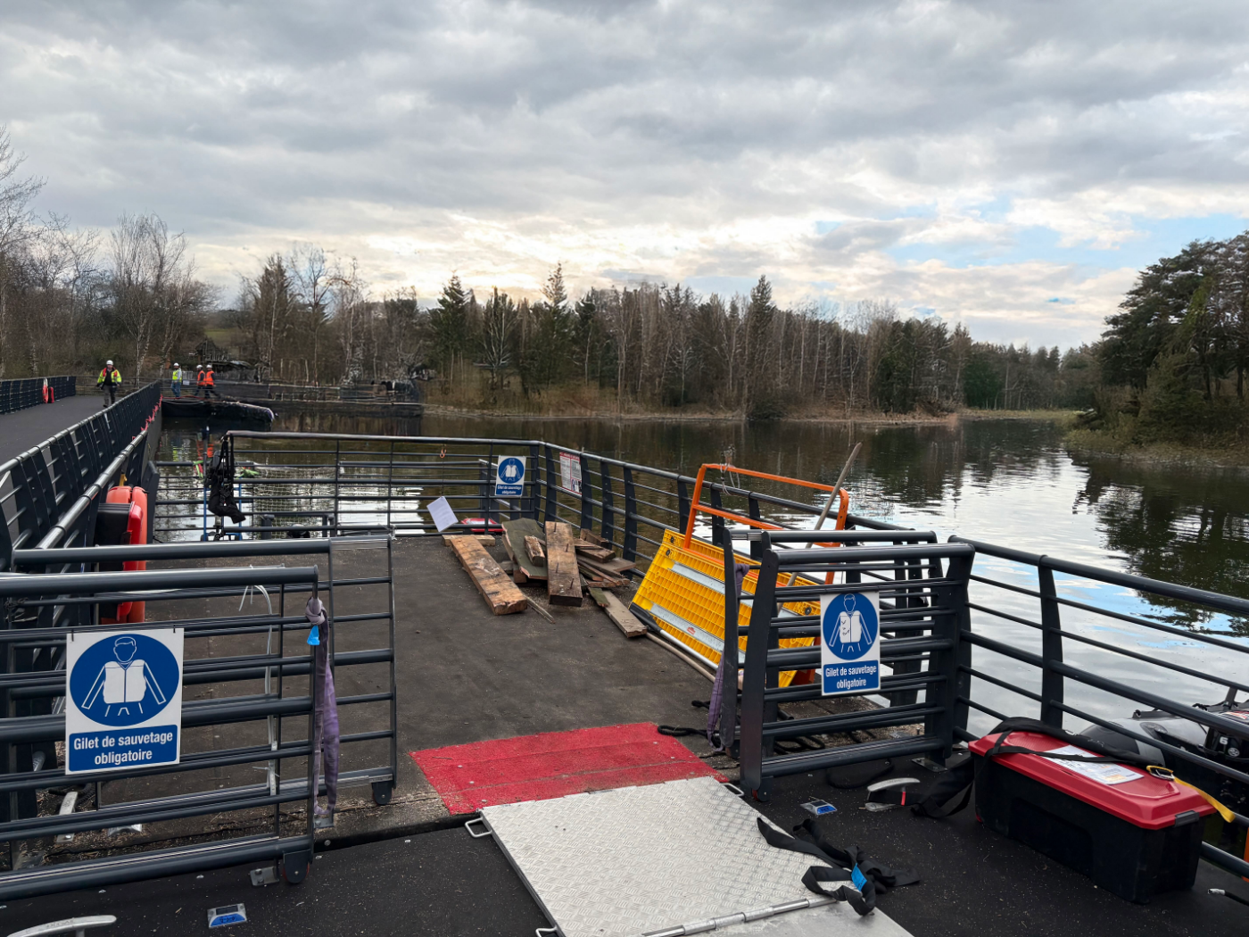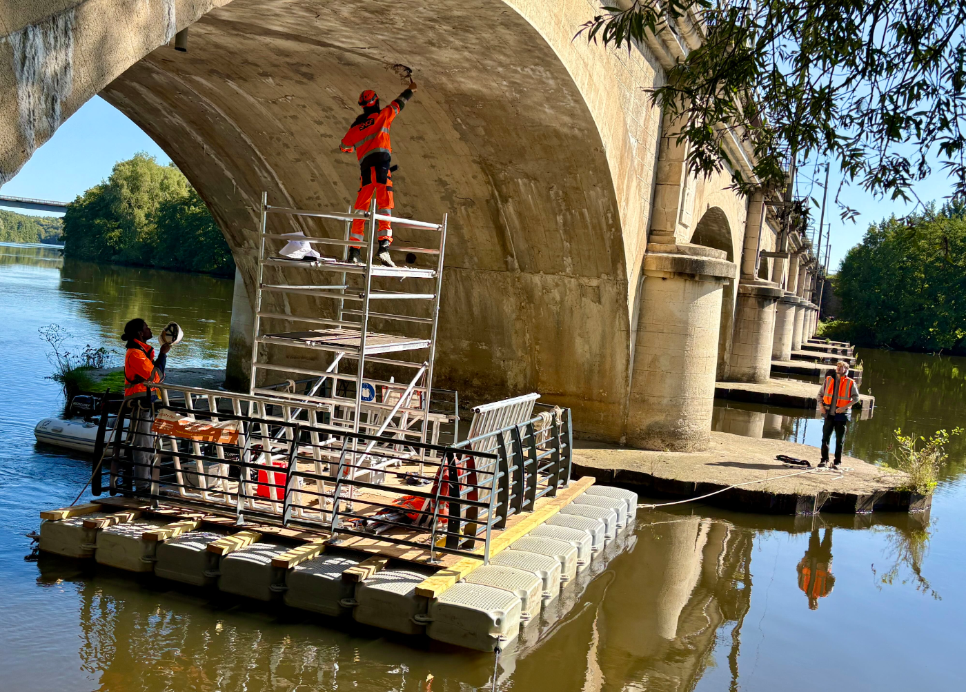 Découvrez en images nos solutions de cheminement flottant, plateforme travail flottante, base vie flottante et barge sécurité chantier installées partout en France.