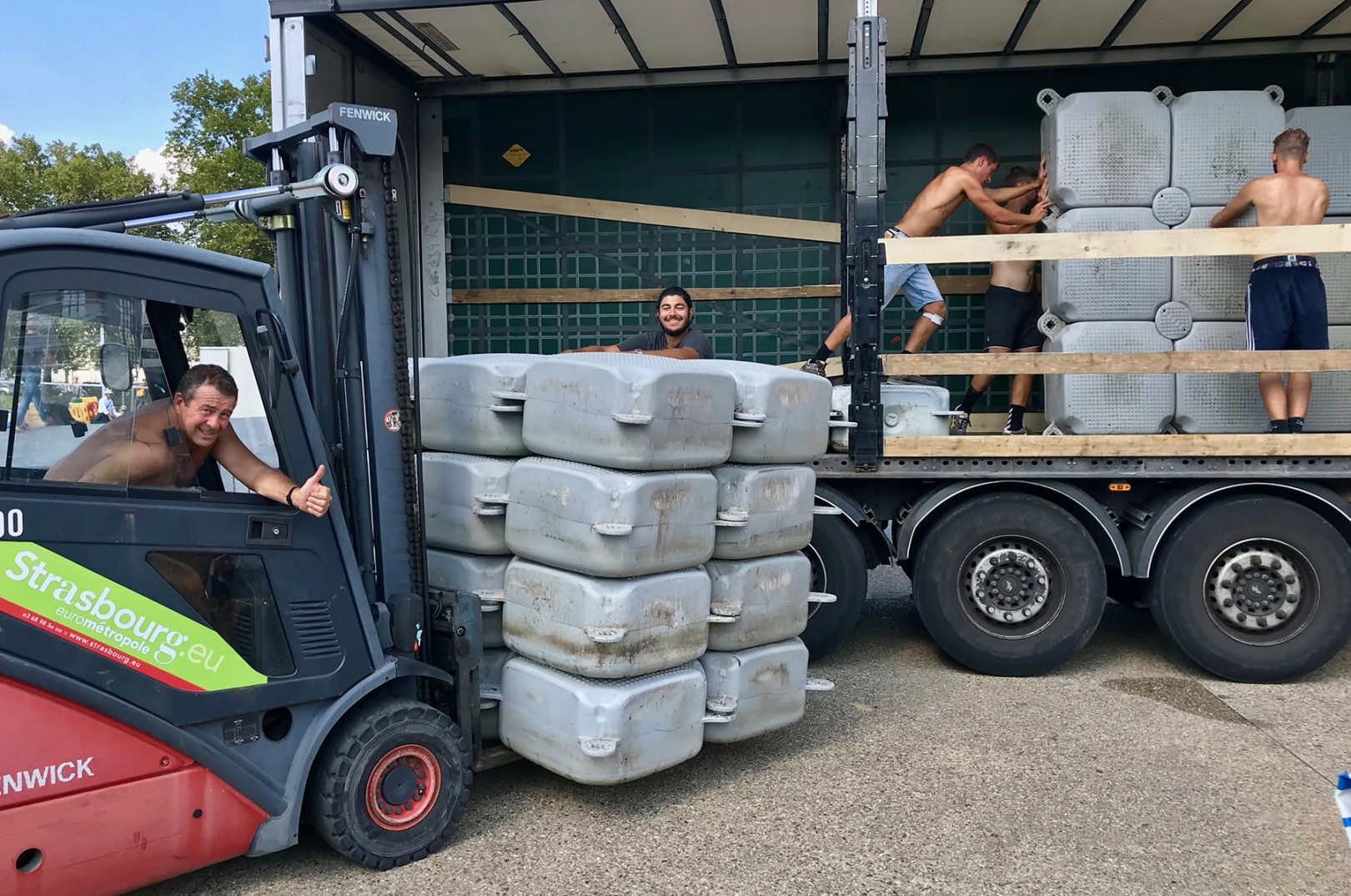 Transport par voie fluviale avec matériel et équipements nautiques fixés sur un ponton flottant déplacé par un bateau pousseur. L’alternative écologique idéale à des trajets par la route. Nous privilégions ce mode de transport dès que possible.